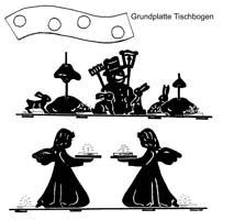 Der Tischbogen ist eine in einem leichten Doppelbogen ausgesägte Sperrholzplatte mit einer Größe von ca. 34 cm Länge und ca. 10 cm Breite. Der Tischbogen kann entweder mit dem Motiv Schneemann oder dem Motiv Engel angefertigt werden. Der Tischbogen wird mit Teelichtern betrieben.